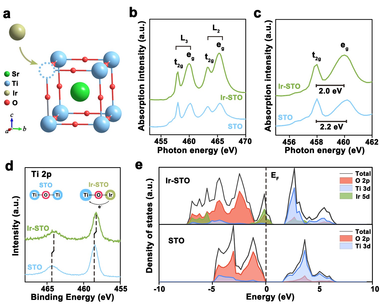 实验结果证明,铱的掺杂能够有效调控钛酸锶钙钛矿(SrTiO3)中钛离子的电子结构,使钛离子周围的电子密度显著增加。理论计算结果表明,Ir的掺杂能够产生跨越费米能级的Ir-O杂化电子态,从而提高材料的导电性。另一方面,Ir的掺杂导致了Ti的3d能带和O的2p能带分别靠近和远离费米能级,进一步验证了其对SrTiO3电子结构的调节作用。