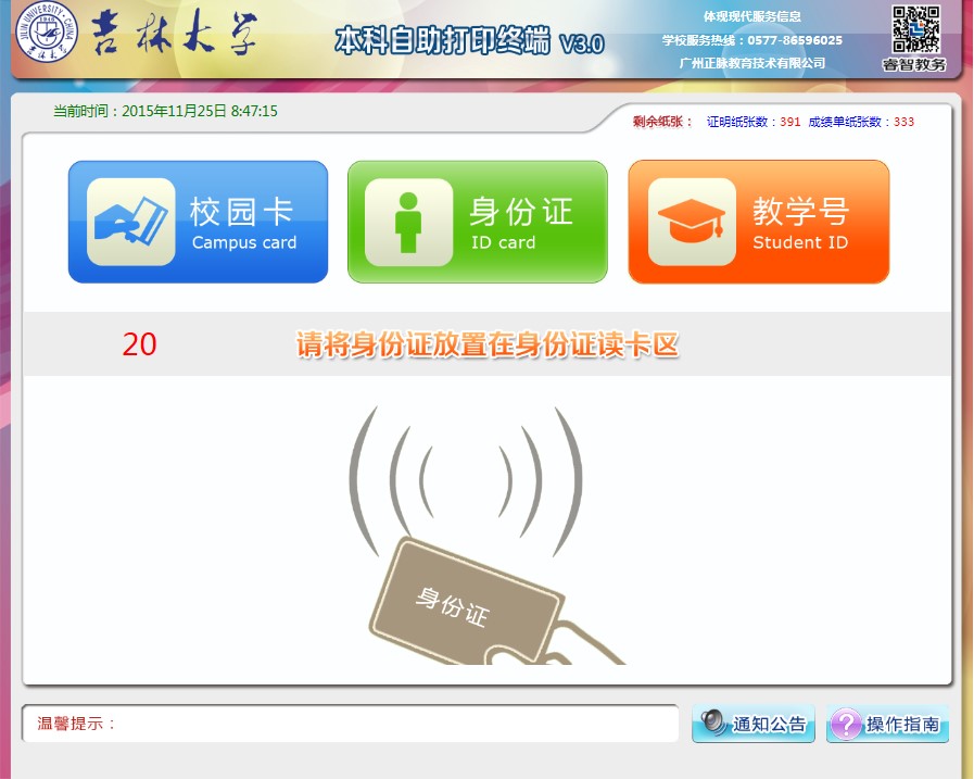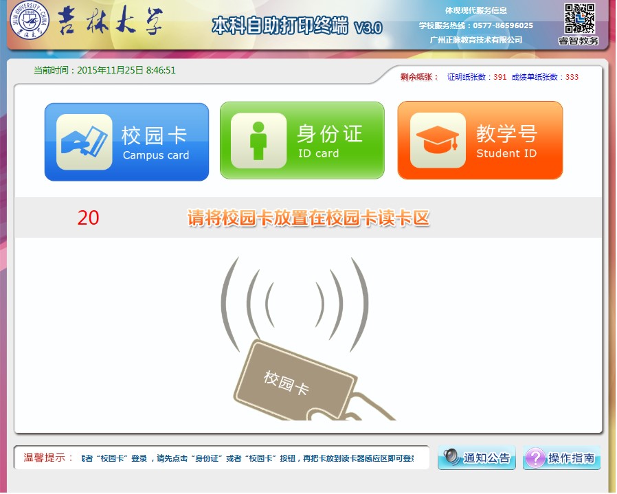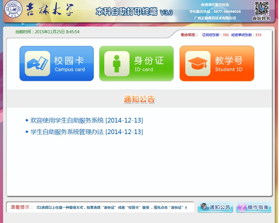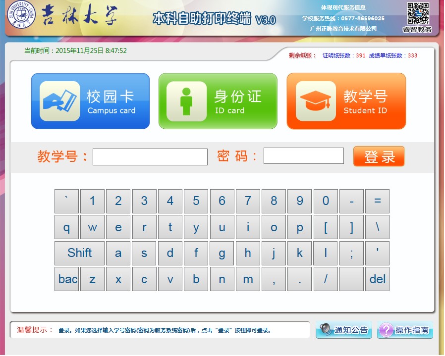 3.如缴费打印后不出纸、英文名字不正确或者打印纸张模糊、重影等问题,可以拨打电话:85168410,或者发邮件:jwzz@jlu.edu.cn,进行登记(登记内容:教学号、姓名、打印时间、问题内容及扣除份数)。管理员将在两日内处理。
