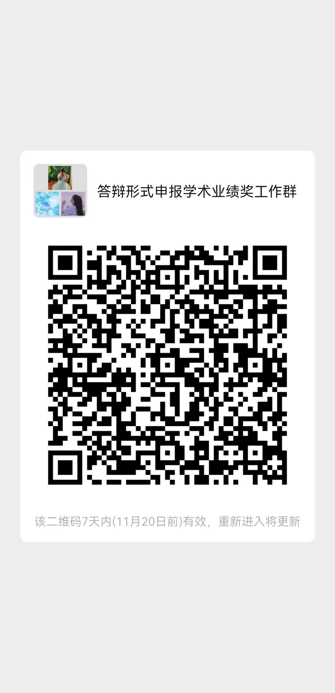 请大家认真看通知,2018年之前毕业生不得参评2019年度公司研究生学术业绩奖学金,申报答辩的同学请于11月14日24点前扫码加入微信群,答辩时间每人5分钟。11月15日进行群内“拟申请奖学金等级”小程序报名。