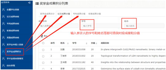 如对申报人成果积分有异议,请登录“伟德国际victor1946智慧校园”中的“公司研究生师生信息综合库”(https://one.jlu.edu.cn/),在【奖学金成果积分】栏进行查询(见下图说明)。