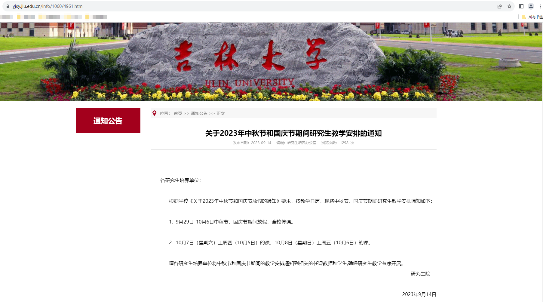 集团开设的公共课,按照研究生院培养办公室2023年09月14日发布的《关于2023年中秋节和国庆节期间研究生教学安排的通知》进行。https://yjsy.jlu.edu.cn/info/1060/4961.htm