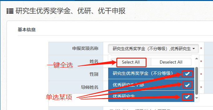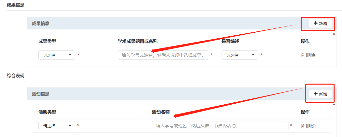 1、申报人请于10月13日8:00前使用个人邮箱账号登录“一张表”平台(https://one.jlu.edu.cn),在“研究生评奖评优管理”-“研究生评奖评优申报”栏,点击【新增(研究生优秀奖学金、优研、优干申报)】进行信息填报,申报研究生优秀奖学金无需选择等级,依据综合得分由高到低自动定级;成果信息栏点击“新增”后输入“姓名或者学号”,然后从已审核通过的成果库中选择不超过3篇代表作参评;活动信息点击“新增”后输入“姓名或者学号”,然后从已审核通过的活动中选择上一学年参与的活动。