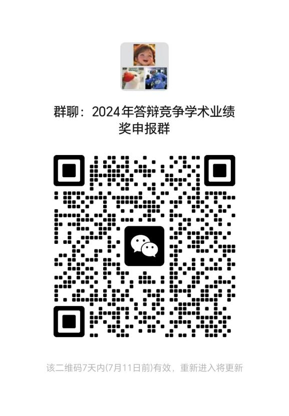 欲以答辩方式申报竞争上一等级奖学金的,即初评【二等奖/三等奖/未获奖】,申请以答辩形式竞争【一等奖/二等奖/三等奖】的,请于7月7日24:00前扫码加入“2024年答辩竞争学术业绩奖申报群”,初评候选人(附件2)序号357-368需通过答辩方式确定4个三等奖人选不参加答辩的视为放弃竞争机会。