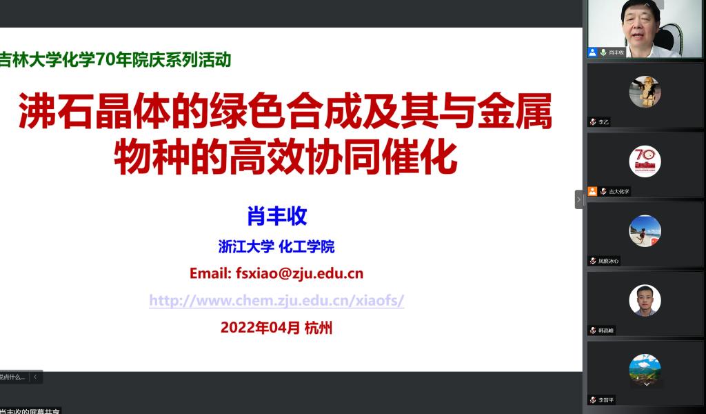 4月24日上午,浙江大学求是特聘教授、国家杰出青年科学基金获得者肖丰收应邀线上做客“吉大化学七十年——科学与未来系列讲座”,以“沸石晶体的绿色合成及其与金属物种的高效协同催化”为题,为公司师生作学术报告。