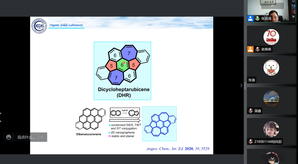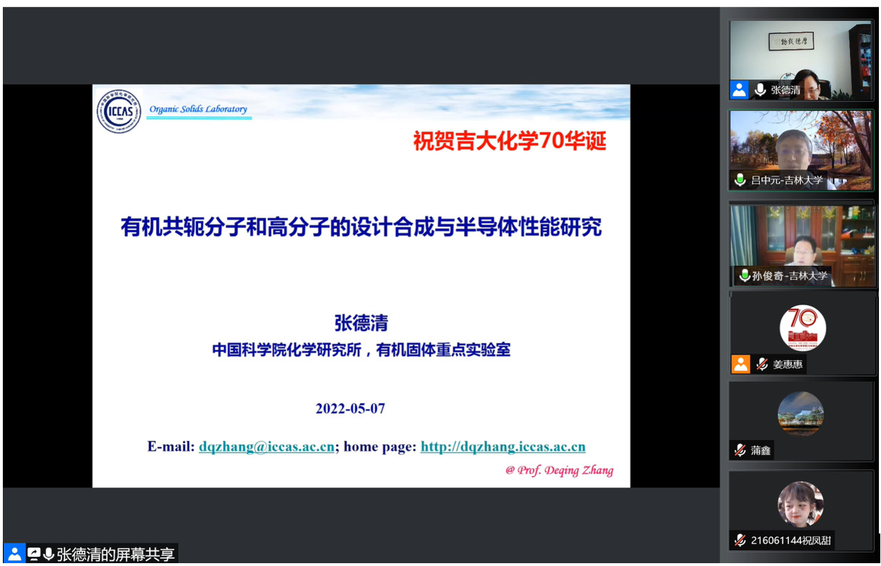 5月7日上午,中国科公司化学研究所研究员、国家杰出青年科学基金获得者张德清应邀线上做客“吉大化学七十年——科学与未来系列讲座”,以“有机共轭分子和高分子的设计合成与半导体性能研究”为题,为公司师生作学术报告。