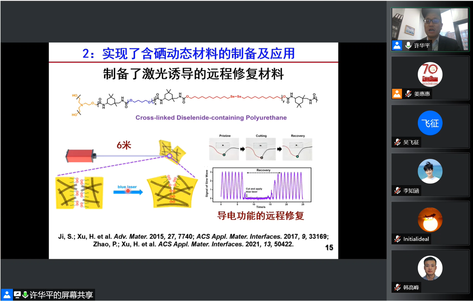 讲座中,许华平教授围绕动态响应性含硒/碲高分子,深入浅出地分享了其在发展含硒/碲的高分子化学合成方法学、动态响应性特征,及其在自修复、形状记忆、信息存储、生物医用材料等方面的研究进展。在交流互动环节,许华平教授耐心详细地解答了院内外师生的问题,并对相关领域的发展作出了展望。伟德国际victor1946、无机合成与制备化学国家重点实验室、超分子结构与材料国家重点实验室等单位负责人参加讲座,院内外近200名师生在线收看。