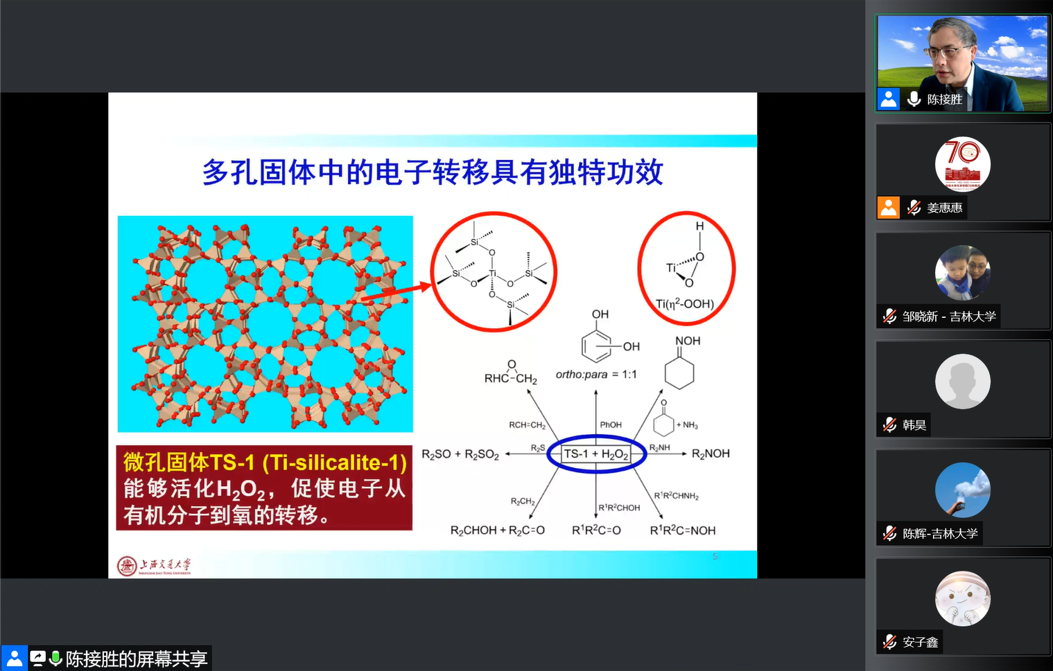 讲座中,陈接胜教授围绕固体中电子转移及催化,深入浅出地分享了其课题组在微孔晶体中制备单核一价锌,开辟非常规价态金属中心构筑新路线,获得新型高效催化活性位点的研究;介绍了通过界面电子转移策略提升金属催化活性,发展一系列性能优异复合固体催化材料的新思路。在交流互动环节,陈接胜教授耐心详细地解答了院内外师生的问题,并对相关领域的发展做出了展望。伟德国际victor1946、无机合成与制备化学国家重点实验室、超分子结构与材料国家重点实验室等单位负责人参加讲座,院内外200余名师生在线收看。