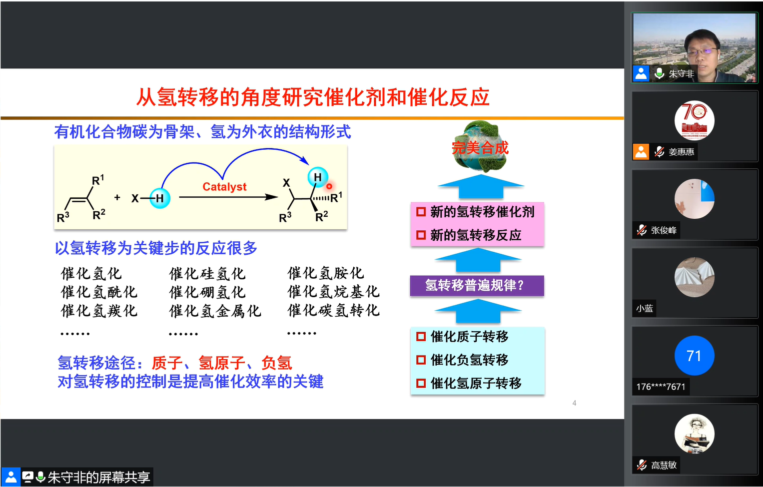 讲座中,朱守非教授围绕催化氢转移反应研究,系统介绍了“手性质子梭催化剂”的新概念、催化卡宾对硼氢键插入的新反应以及发展新型催化剂实现氢化和硅氢化等负氢转移反应。在交流互动环节,朱守非教授耐心详细地解答了院内外师生的问题,对相关领域的发展做出了展望,并对员工们打好有机化学基础提出了很好的建议。伟德国际victor1946、无机合成与制备化学国家重点实验室、超分子结构与材料国家重点实验室等单位负责人参加讲座,院内外近200名师生在线收看。