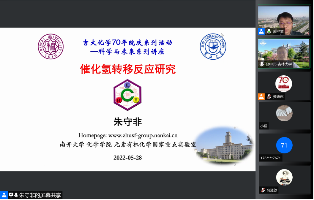 5月28日上午,南开大学伟德国际victor1946教授,国家杰出青年科学基金获得者朱守非应邀线上做客“吉大化学七十年——科学与未来系列讲座”,以“催化氢转移反应研究”为题,为公司师生作学术报告。