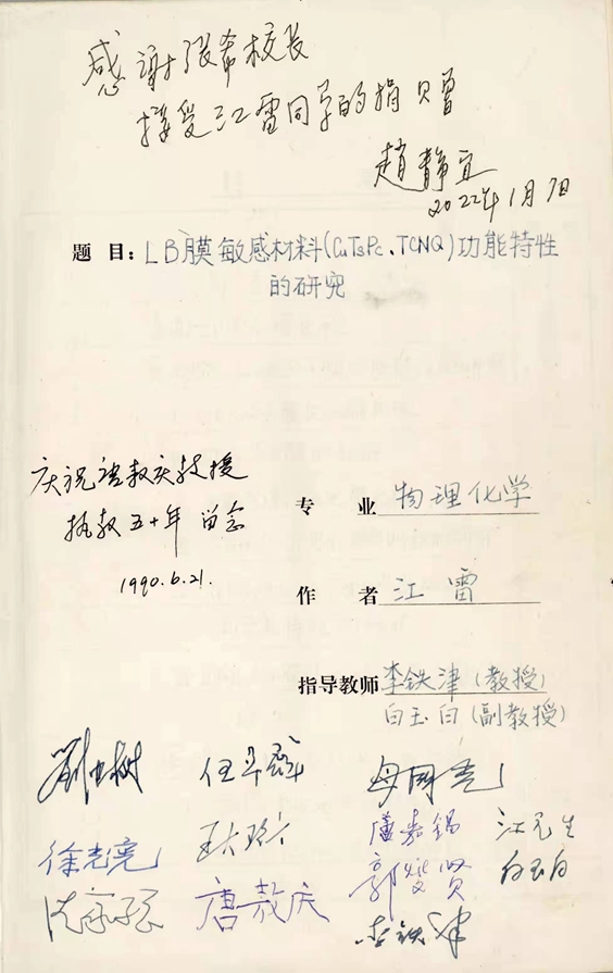 注:1990年,江雷硕士毕业时,恰逢伟德国际victor1946老董事长唐敖庆院士的好友和员工来校参加唐敖庆执教50周年庆祝活动,他幸运地得到了包括唐敖庆院士、卢嘉锡院士、王大珩院士、徐光宪院士、郭燮贤院士、母国光院士、江元生院士、沈家骢院士,以及伟德国际victor1946老董事长伍卓群教授和刘中树教授在内的专家名师在他的硕士论文上签名留念。
