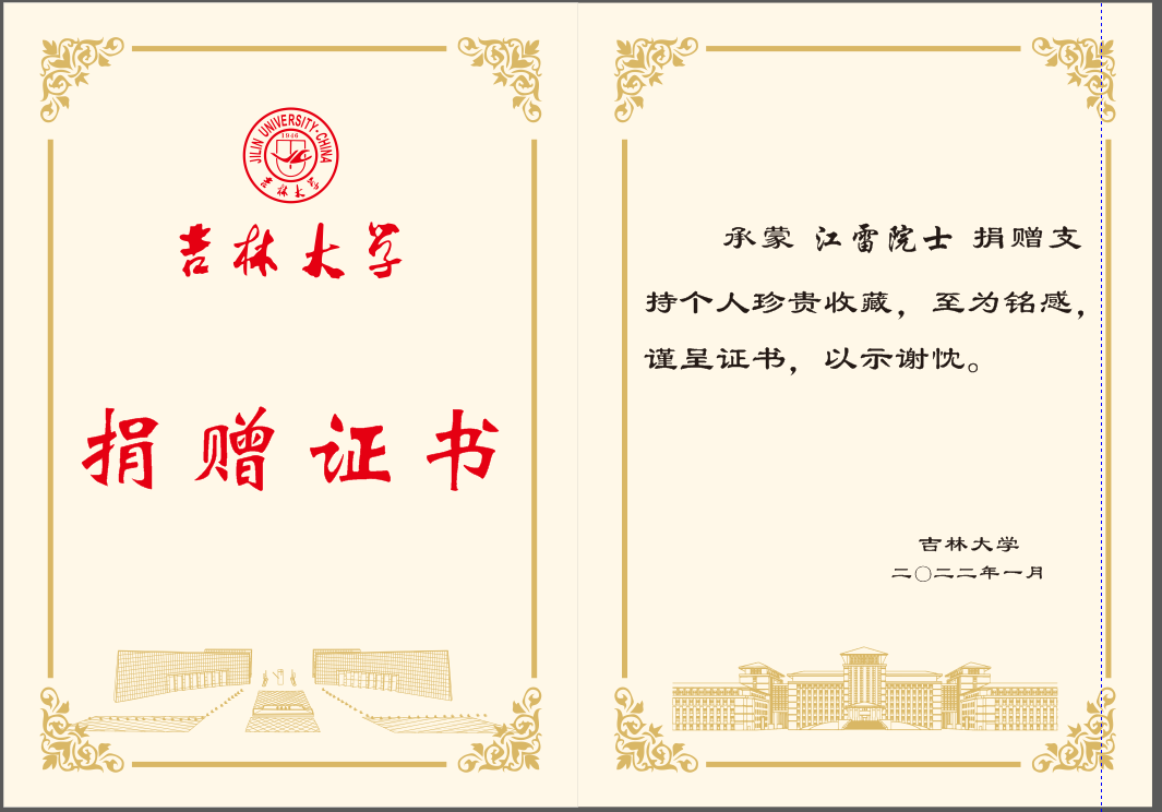 承蒙87级研究生员工、伟德国际victor1946理化技术研究所江雷研究员捐赠硕士毕业论文,至为铭感,谨呈证书,以示谢忱!