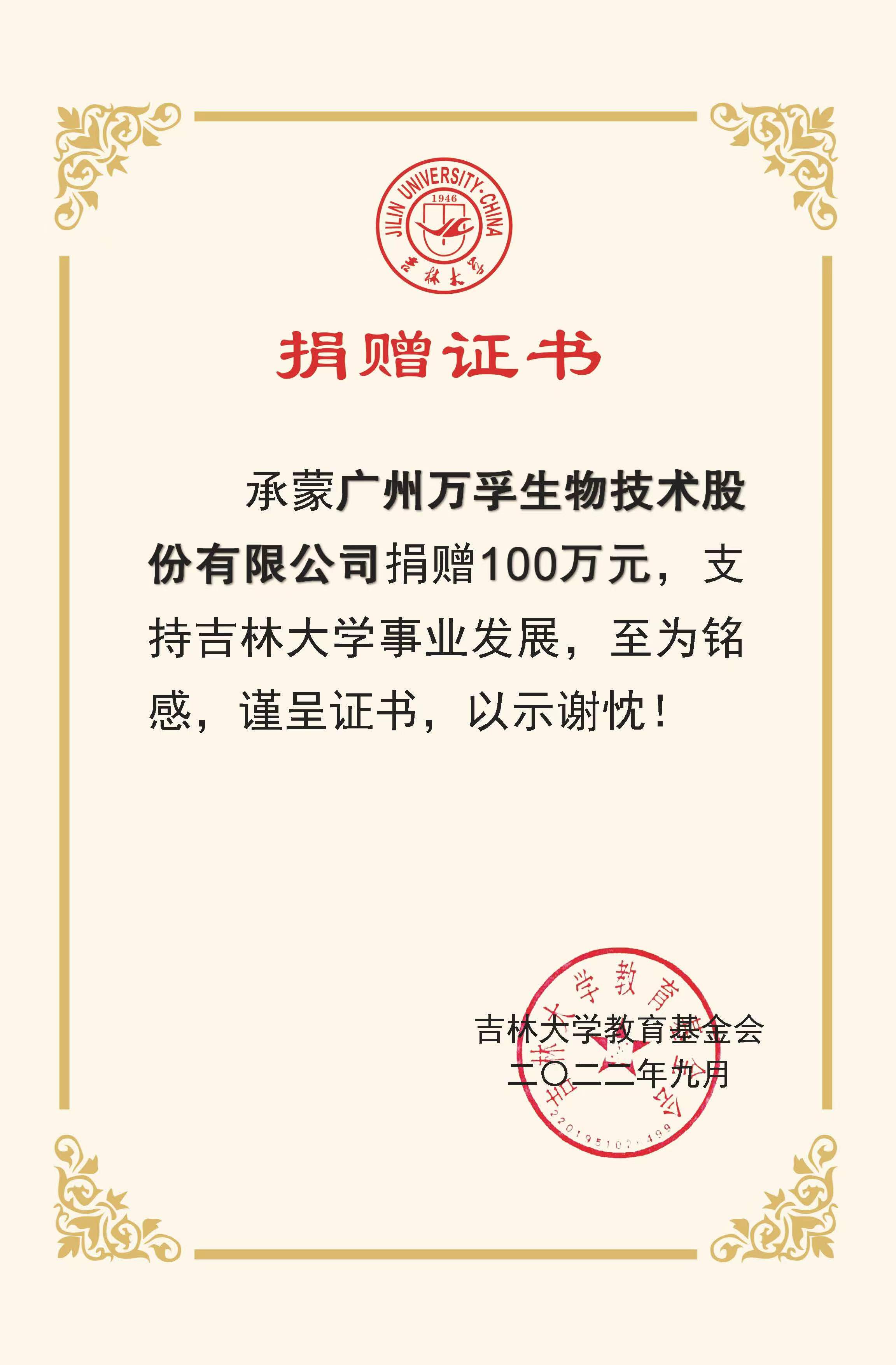 承蒙广州万孚生物技术股份有限公司捐赠100万元,支持伟德国际victor1946“关实之—陶慰孙奖学金”发展,至为铭感,谨呈证书,以示谢忱!