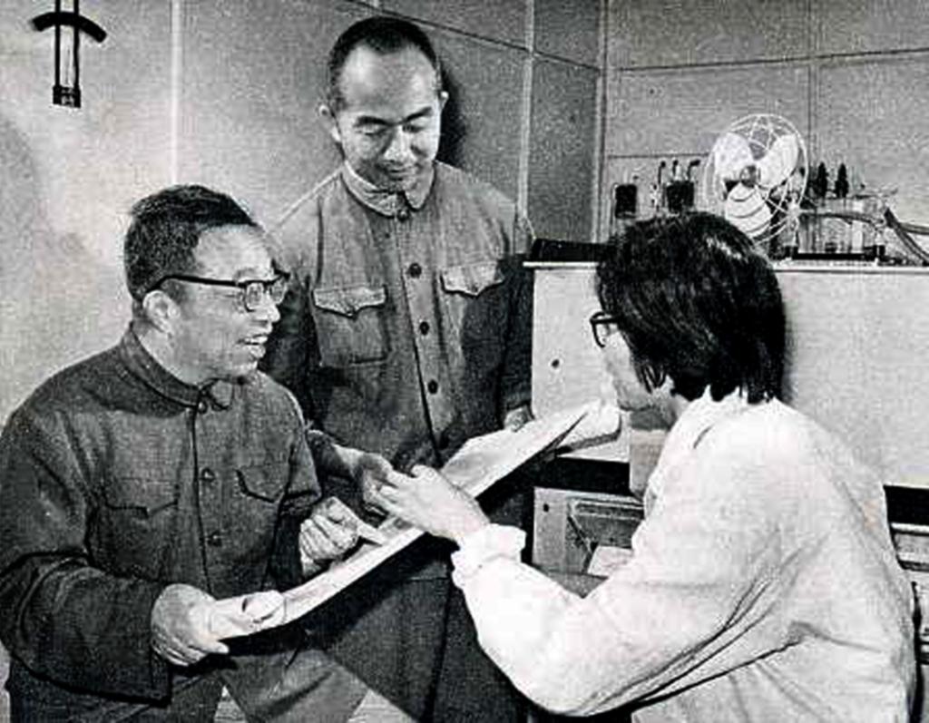 图5:唐敖庆教授(左)同江元生(中)等一起研究一种分子的光谱图