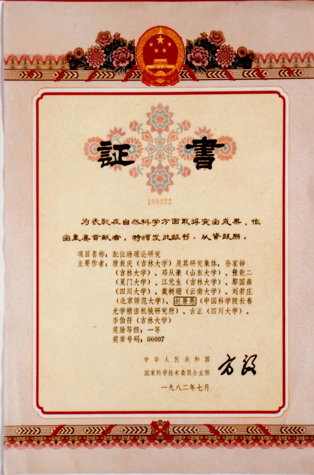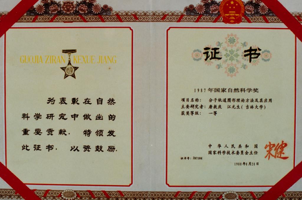 图10:唐敖庆、江元生等人获得1987年国家自然科学奖一等奖证书
