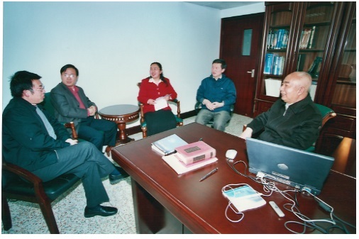 图4:唐敖庆教授(左1)在指导江元生(右1)等人