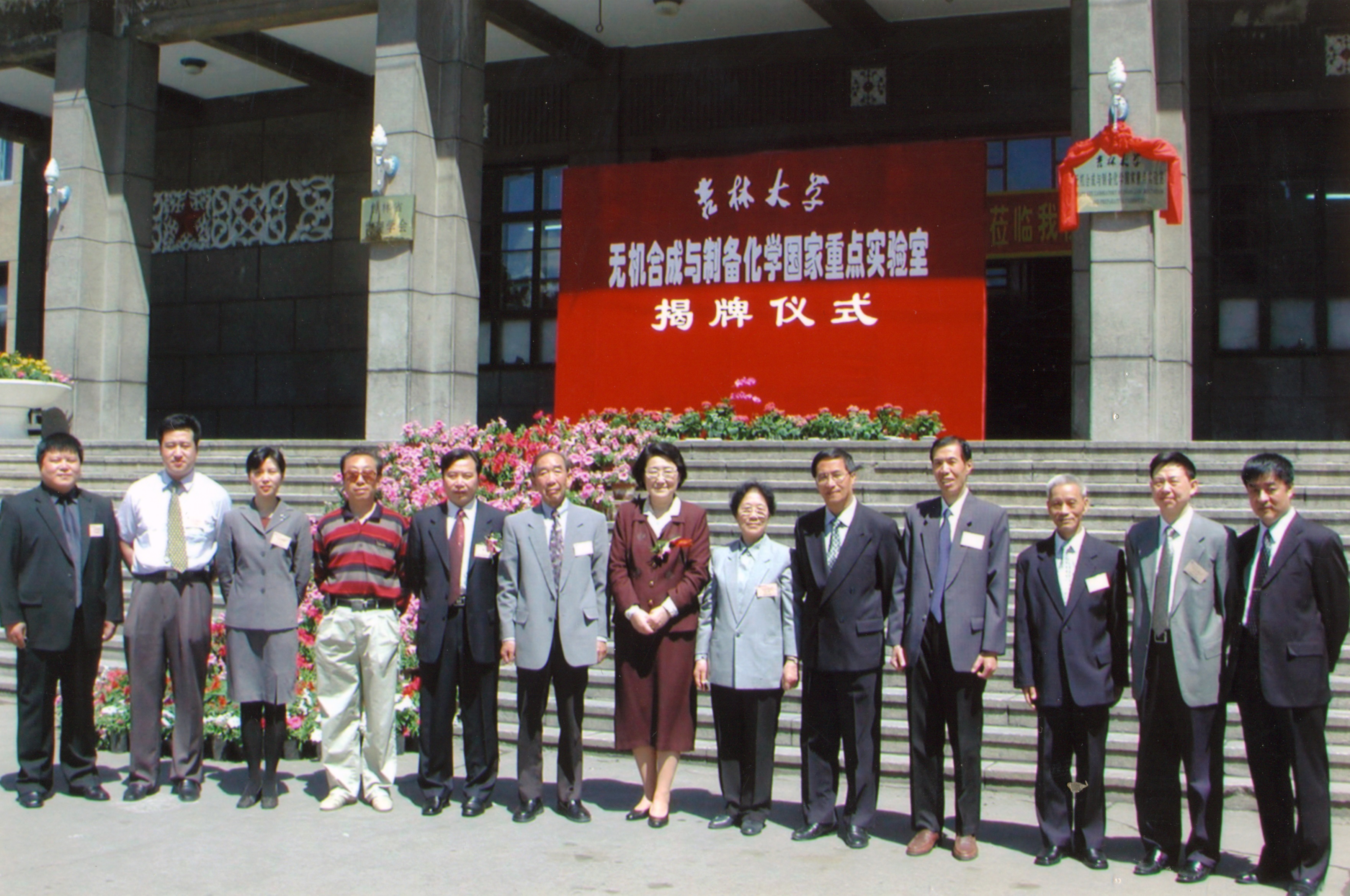 图17:2001年5月,在伟德国际victor1946举行无机合成与制备化学国家重点实验室揭牌仪式(前排左起:薛亦深、丁世海、于吉红、付国良、冯守华、徐如人、刘淑莹、庞文琴、吴通好、李连生、徐翊华、肖丰收、程树海)
