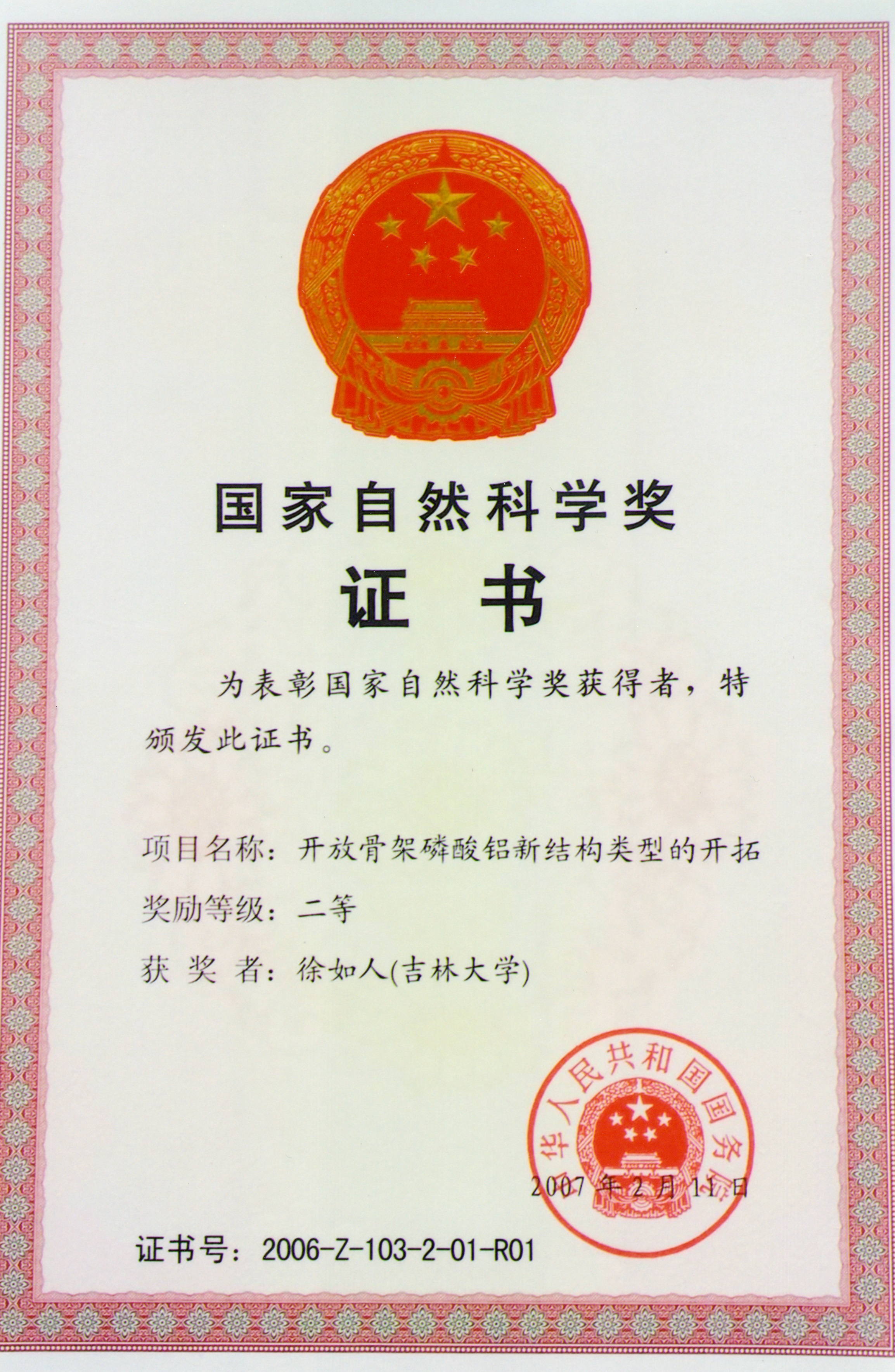 图12:2007年,徐如人课题组获国家自然科学二等奖证书