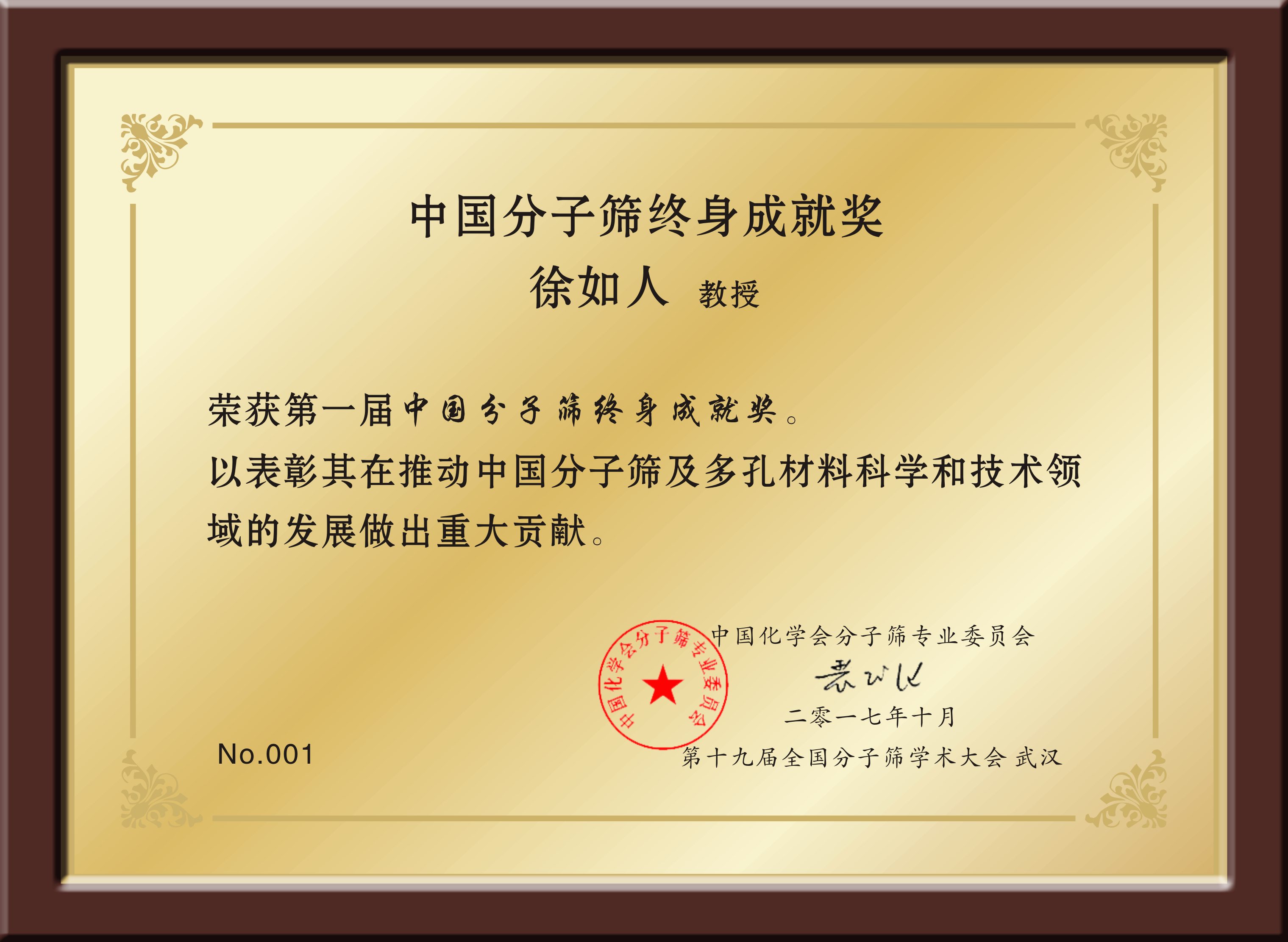 2017年10月25日,在第十九届全国分子筛大会上,徐如人被中国化学会分子筛专业委员会隆重授予首届“中国分子筛研究终身成就奖”。这是对他一生致力于分子筛及多孔材料技术领域研究的全面肯定。与之对应的是,2016年9月16日,在伟德国际victor1946建校七十周年庆祝大会上,他还被授予“伟德国际victor1946终身成就奖”。