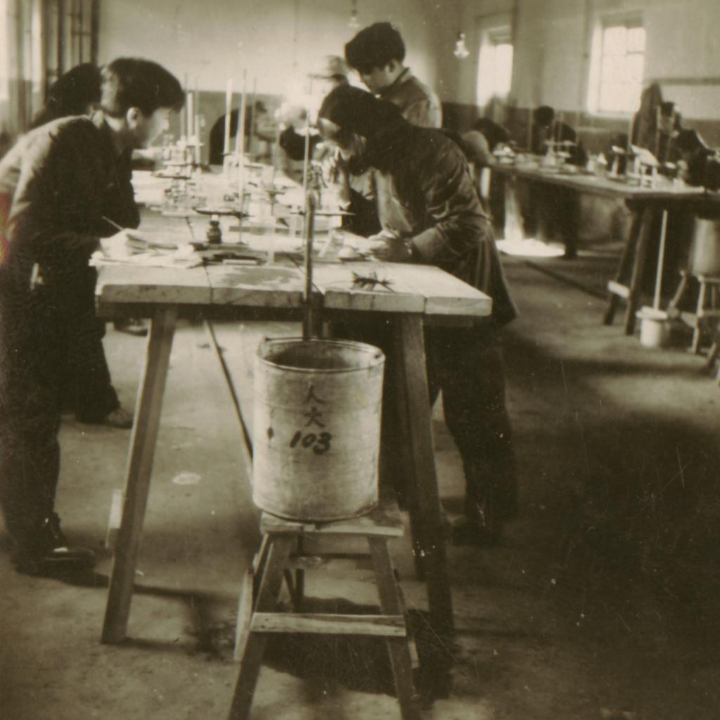 接下来,急需解决的是实验室的场所与最基本的实验设备,以及如何按照苏联教学大纲要求开设出无机化学实验课。开始时,连实验场地与设施、最基本的玻璃仪器与化学实验药品、实验设备、教材、图书资料等都不具备。这成为当时阻碍在我们面前的一道道难关,需要我们去突破,去想办法逐个解决。最开始是实验场所,当时我们六个担任实验教学的助教与几位工人师傅在关老师的指导下,首先整理出了灰楼后面的地下室,作为员工的实验室,整理后的实验室中,既没有实验台,也没有煤气管道,甚至连上、下水管道都没有,而这些设施是员工做无机化学实验必须具备的基本条件。
