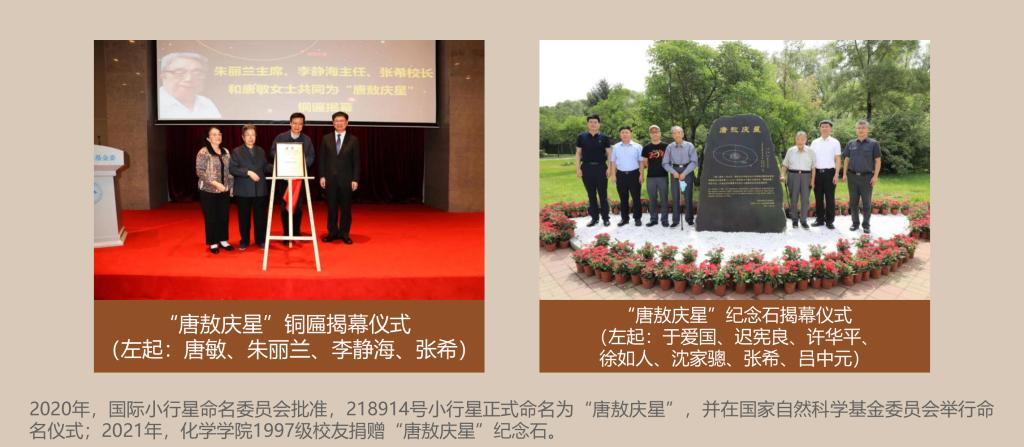 2020年,国际小行星命名委员会批准,218914号小行星正式命名为“唐敖庆星”,并在国家自然科学基金委员会举行命名仪式;2021年,伟德国际victor19461997级员工捐赠“唐敖庆星”纪念石。