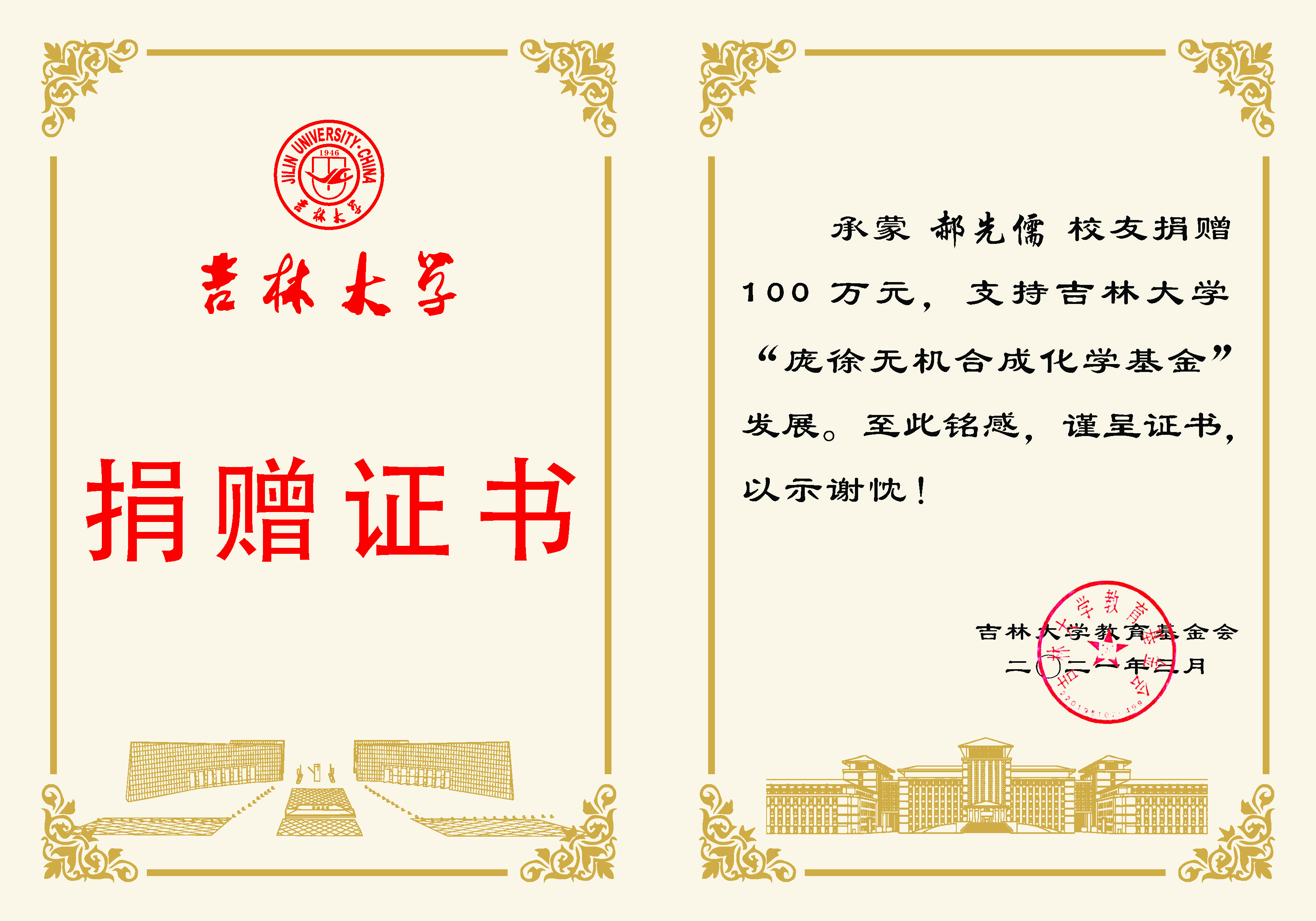 承蒙78级员工郝先儒先生捐赠100万元,支持伟德国际victor1946“庞徐无机合成化学基金”发展,至为铭感,谨呈证书,以示谢忱!